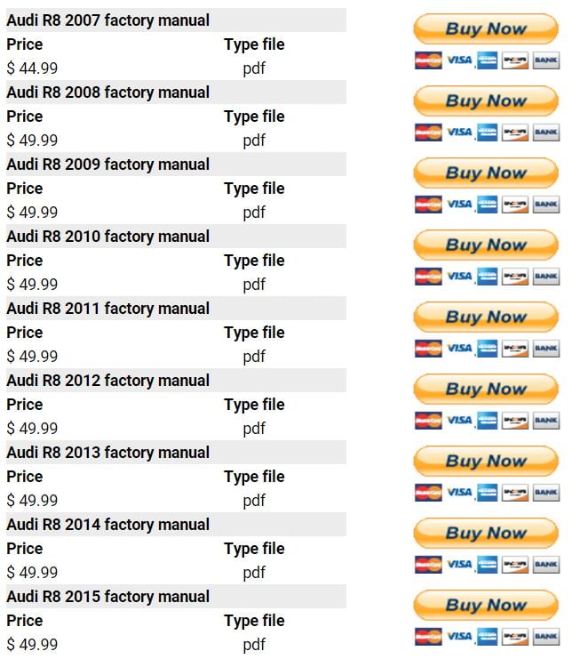Audi R8 2007 2008 2009 2010 2011 2012 2013 2014 2015 repair manual